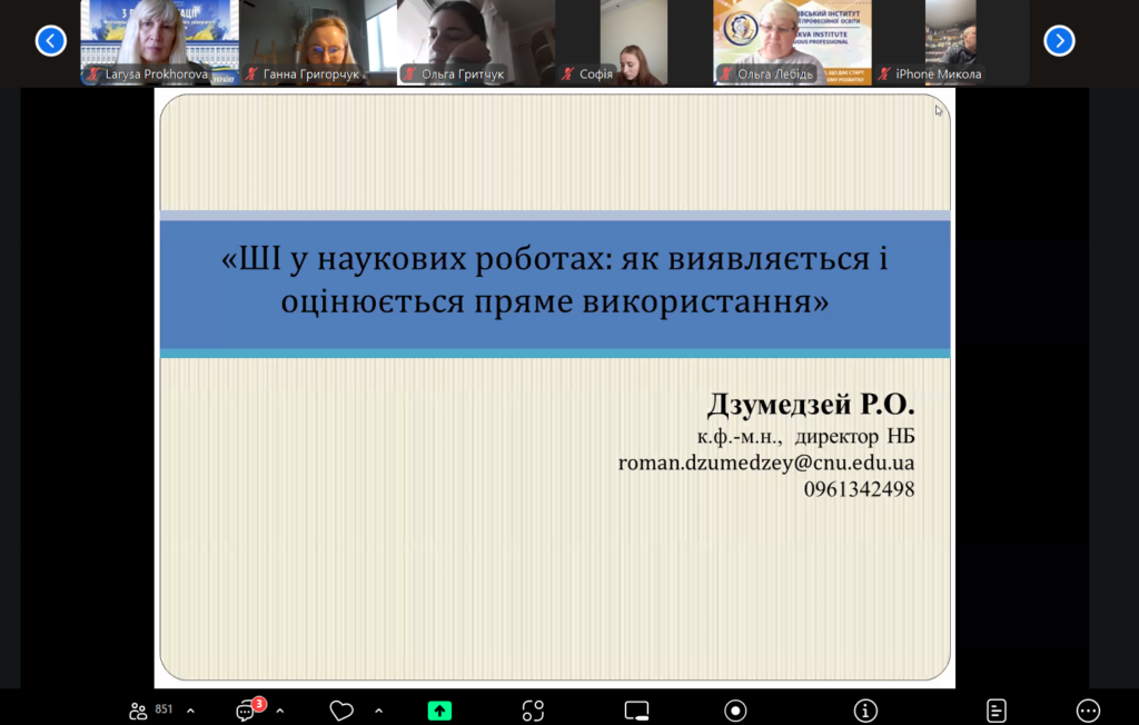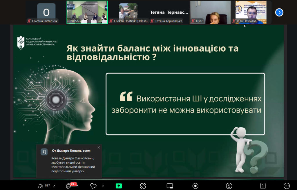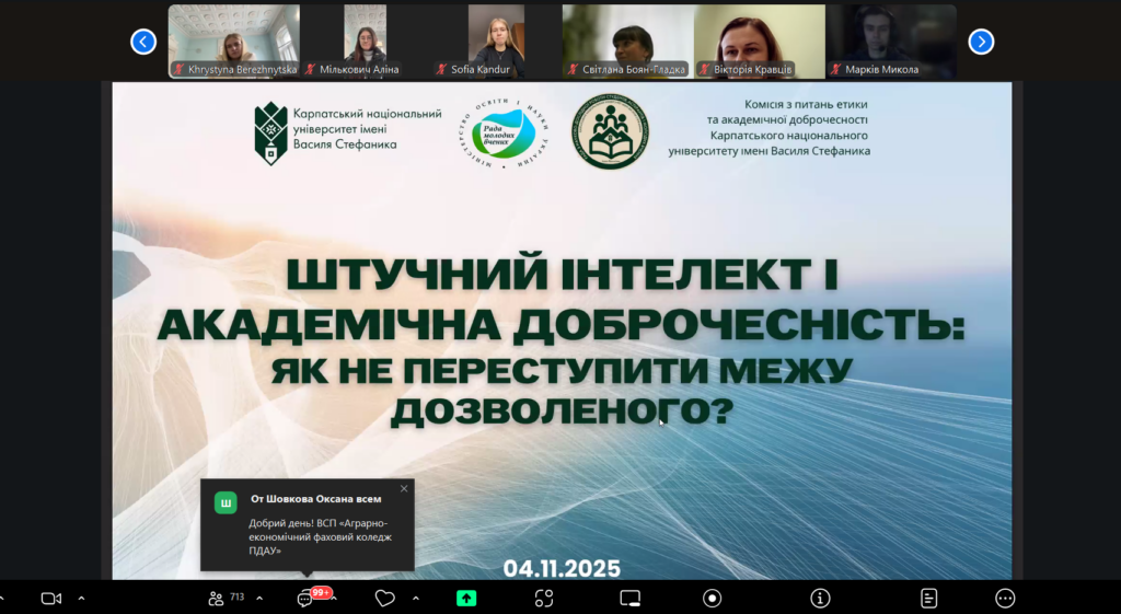 Основною тематикою заходу стали питання академічної доброчесності та відповідального використання штучного інтелекту в освіті й науці. Активна зацікавленість учасників підтвердила актуальність обраної проблематики та її значущість для сучасного наукового й освітнього середовища.