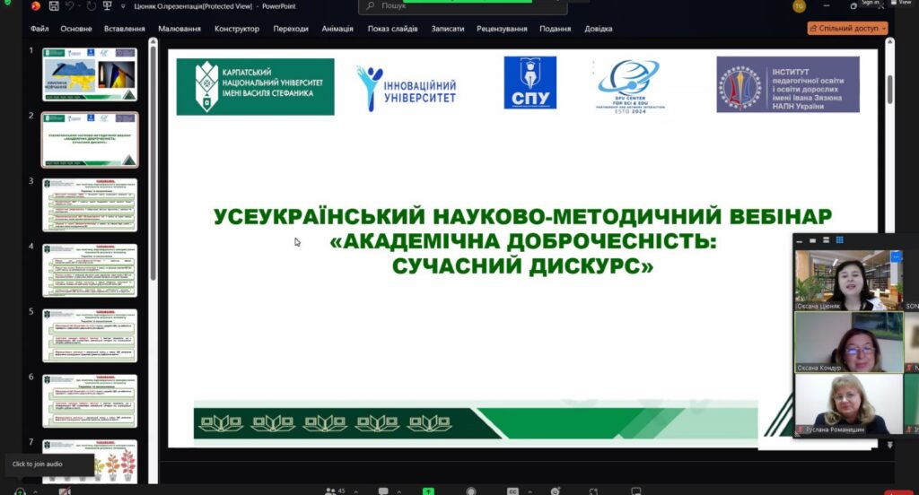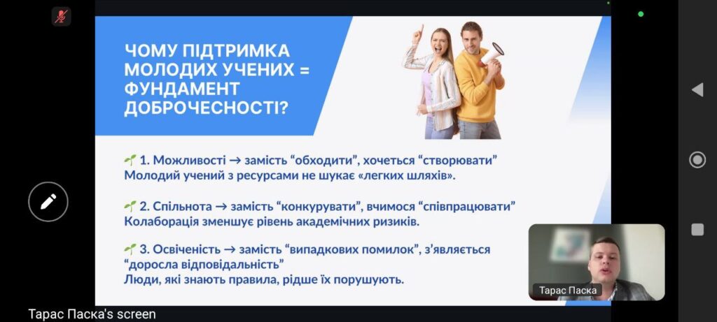 Підсумовуючи роботу заходу, модераторка вебінару Оксана Цюняк наголосила, що формування зрілої культури академічної доброчесності можливе лише за умови тісної взаємодії викладачів, молодих учених і студентської спільноти.